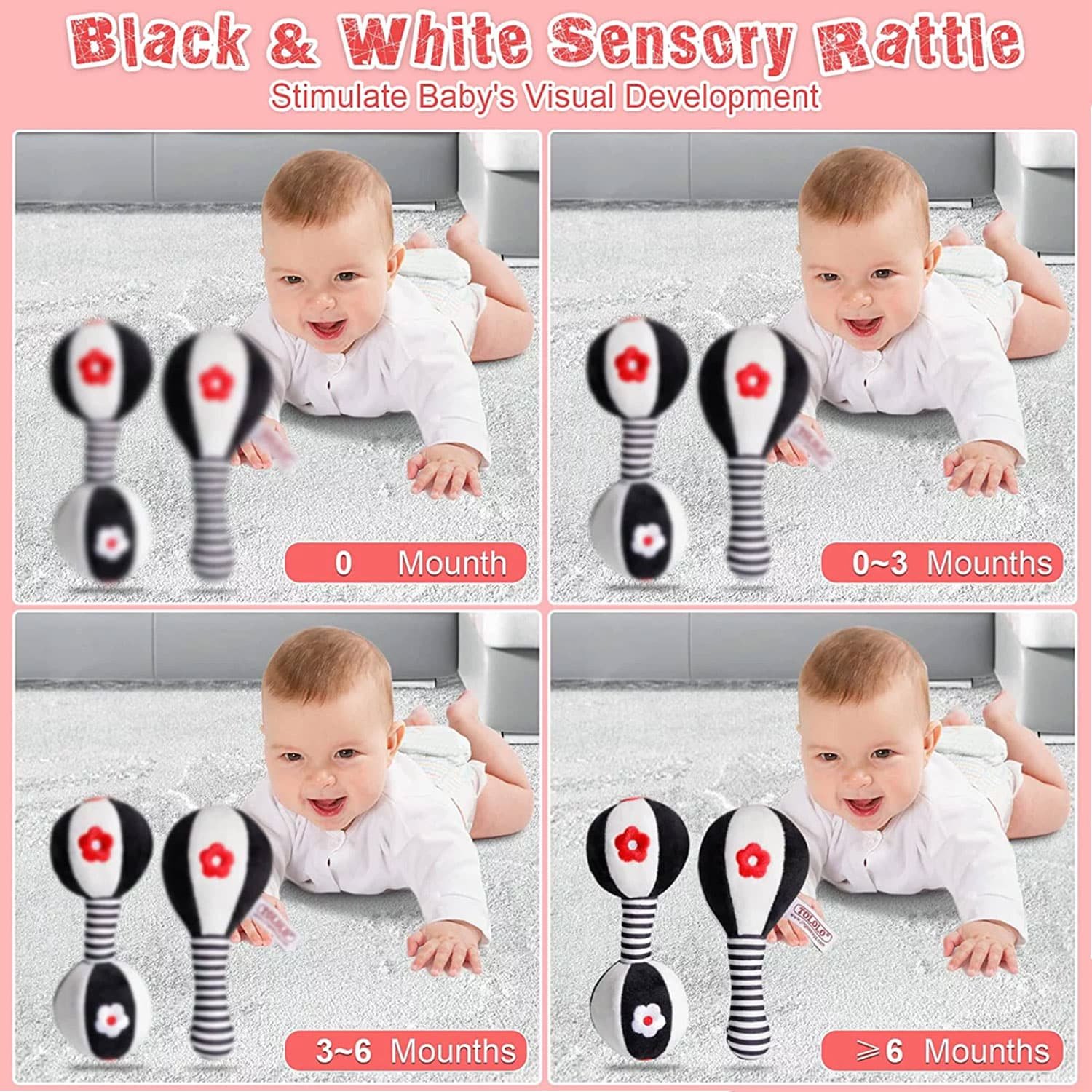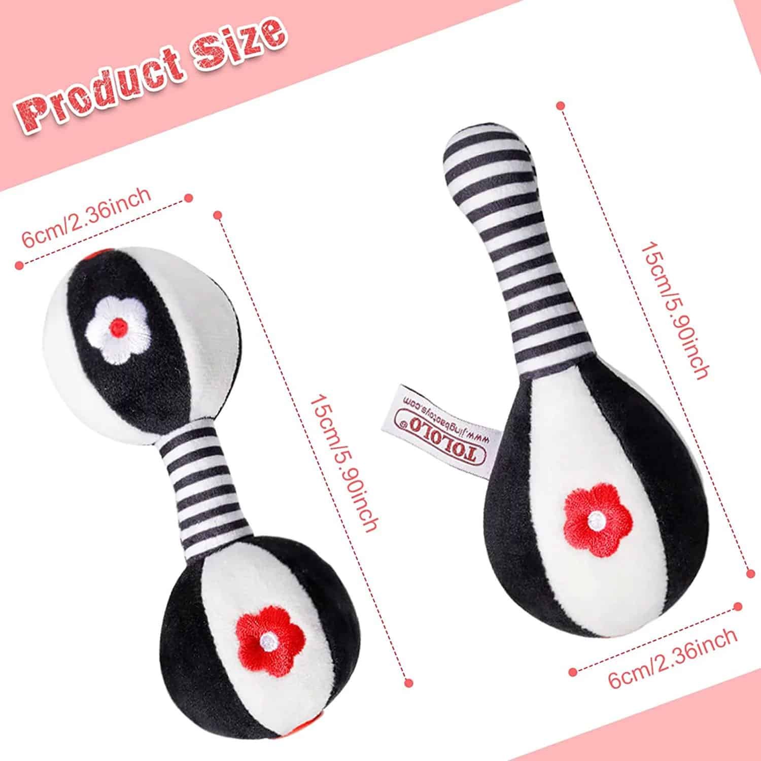 Crafted with utmost care, the baby dumbbell rattles feature a combination of black and white patterns, known for their visual appeal to infants. The soft, gentle rattling sound provides auditory stimulation, fostering sensory development in the early stages.
